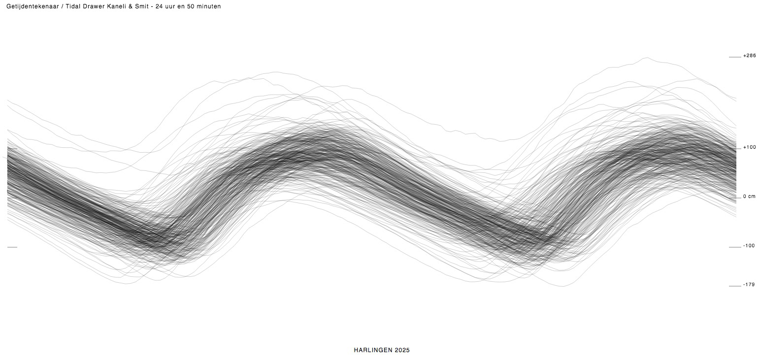 Getijden van Harlingen, 1 januari t/m 31 december 2025, verdeeld in stukken van 24 uur en 50 minuten.