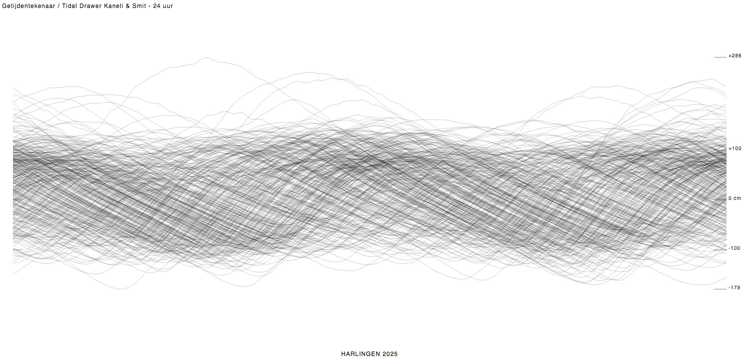 Getijden van Harlingen, 1 januari t/m 31 december 2025, verdeeld in stukken van 24 uur.